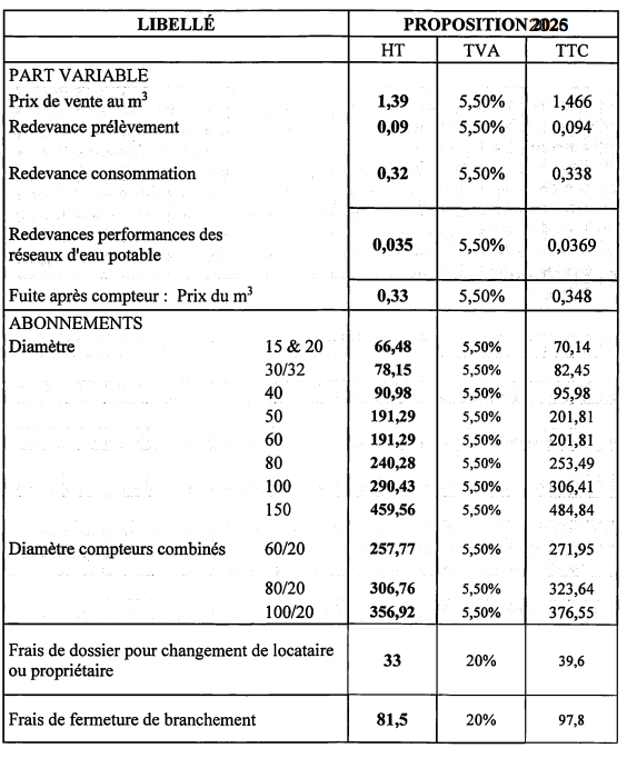 Tarifs au 01/01/2025